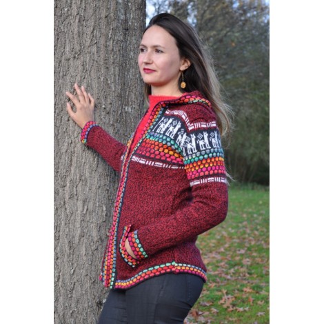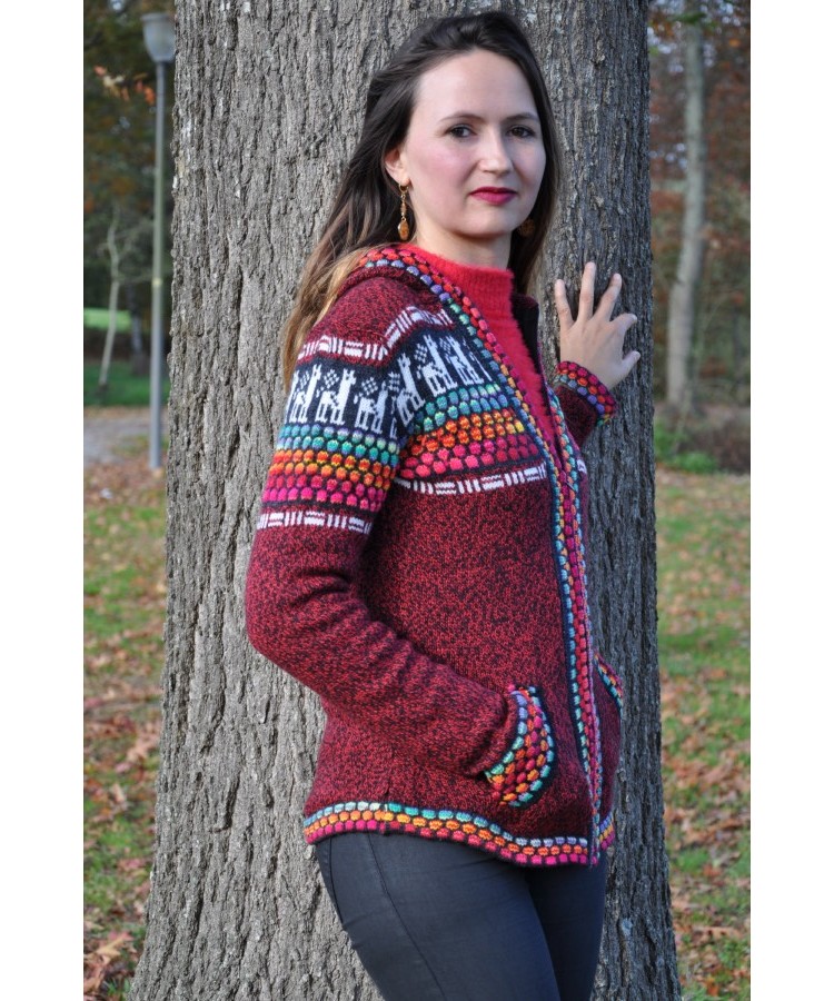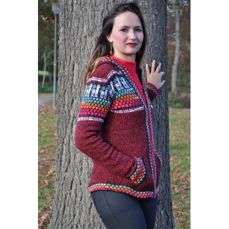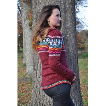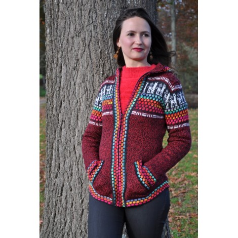 Ce modèle ample séduit par ses belles finitions : deux poches frontales, motifs andins délicatement travaillés sur la poitrine, capuche et fermeture zippée pour un style à la fois chic et pratique.