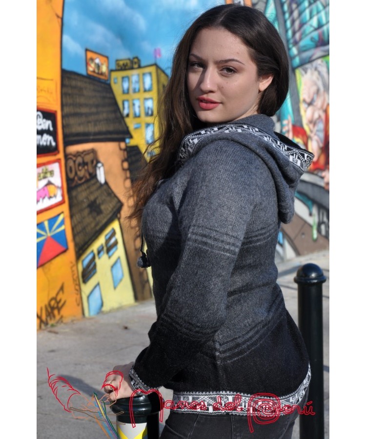 Très beau pull original avec sa capuche et ses motifs linéaires avec des petits lamas. Pull léger, chaud, très agréable à porter en toute circonstance.