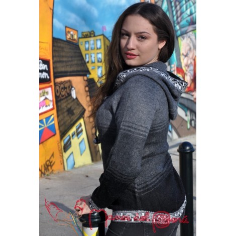 Pull à capuche, coupe cintré, avec un col en V fermé par des lacets en laine.