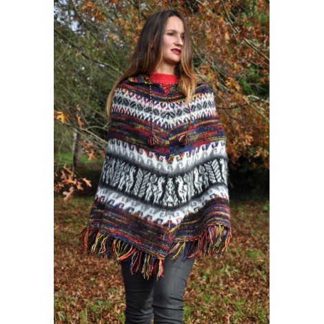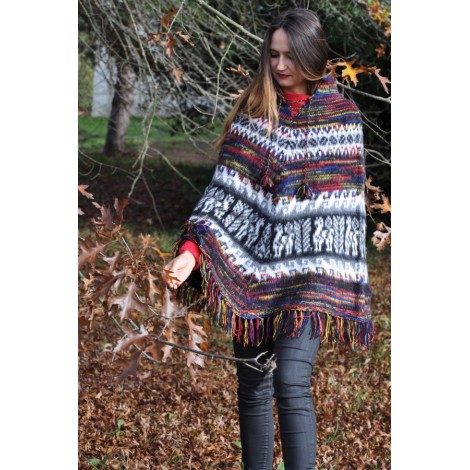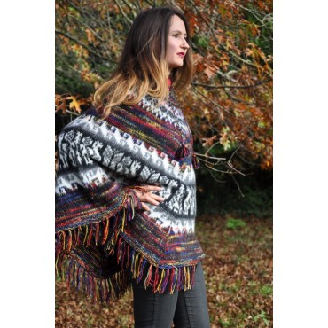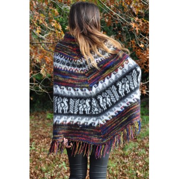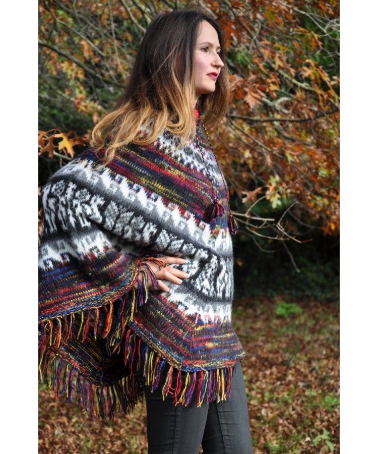 Poncho femme doux et luxueux, tricoté en laine d’alpaga, l’une des fibres naturelles les plus fines. Ses mélanges de couleurs rappellent les nuances éclatantes de l’arc-en-ciel.