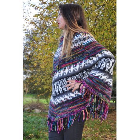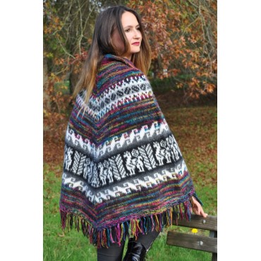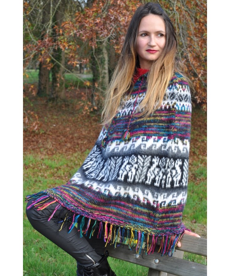 Poncho femme doux et luxueux, tricoté en laine d’alpaga, l’une des fibres naturelles les plus fines. Ses mélanges de couleurs rappellent les nuances éclatantes de l’arc-en-ciel.