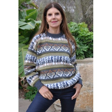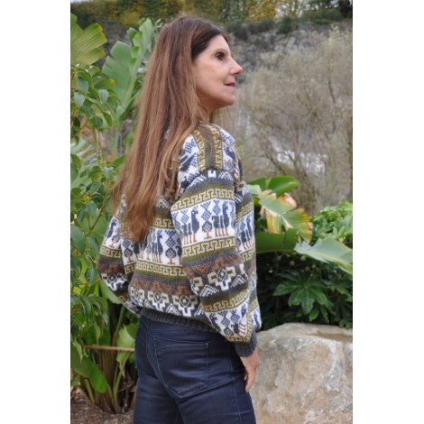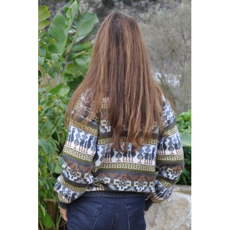 Très beau pull péruvien original avec des motifs représentant des dessins géométriques au niveau de la poitrine.