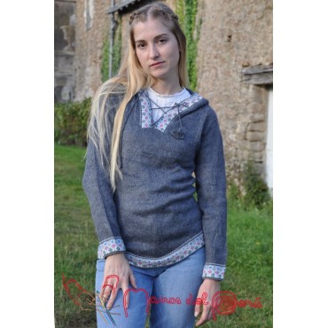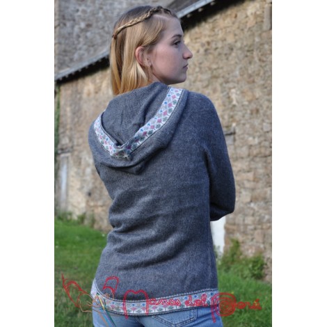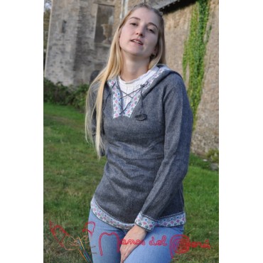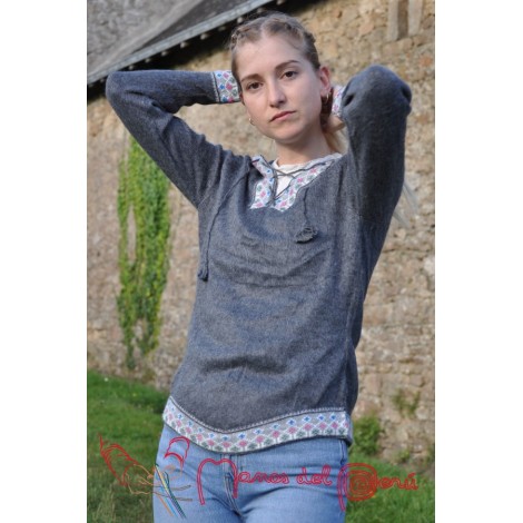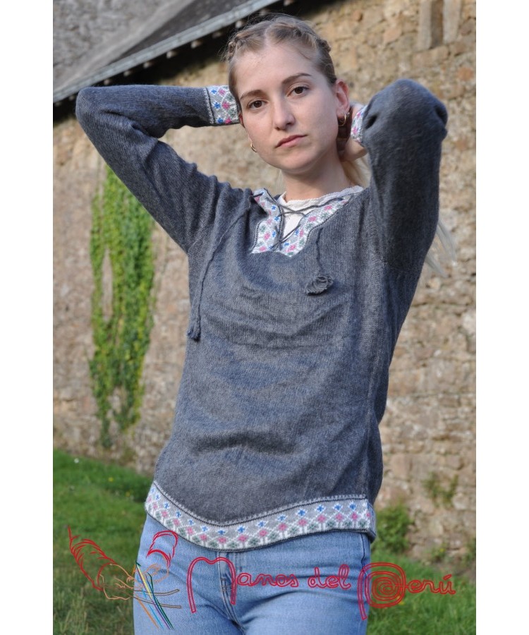 Pull coupe cintré avec capuche, coupe cintré et motifs géométriques andins.