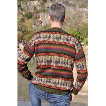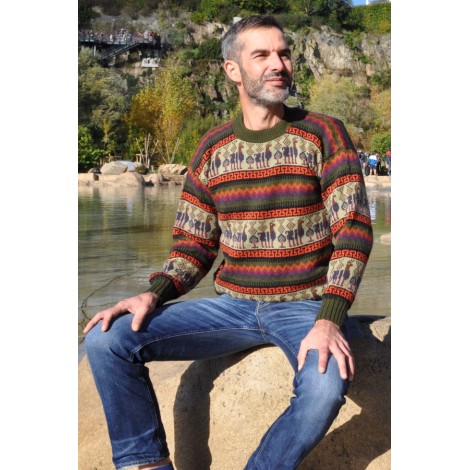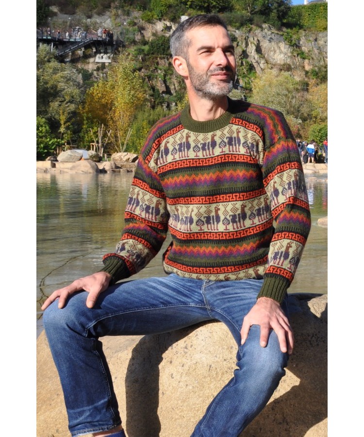 Pull fin pour homme aux couleurs dominantes brique et vert kaki. Ce pull tricoté avec une belle finition est un vêtement élégant et très agréable à porter avec ses motifs typiques péruviens.
