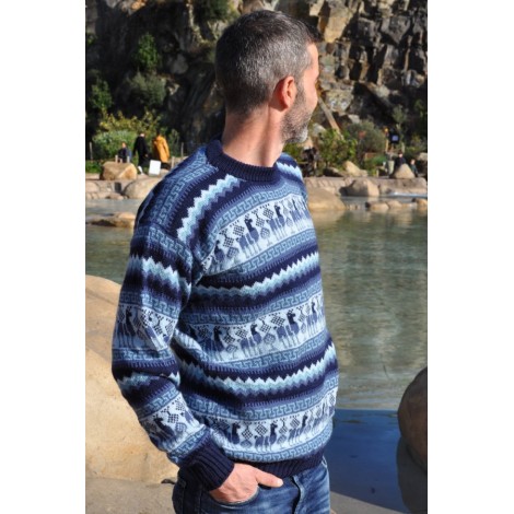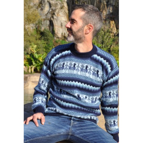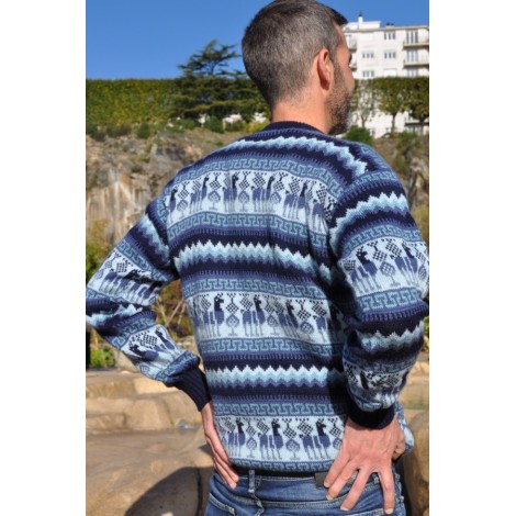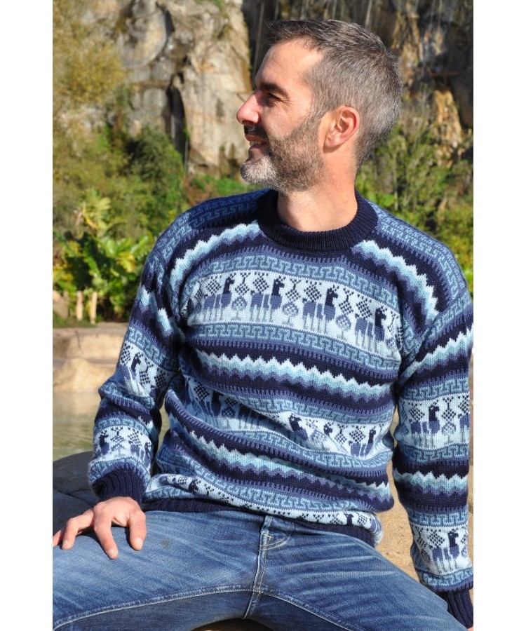 Pull jacquard épais pour homme, aux couleurs dominantes bleu, orné de motifs lamas typiques.