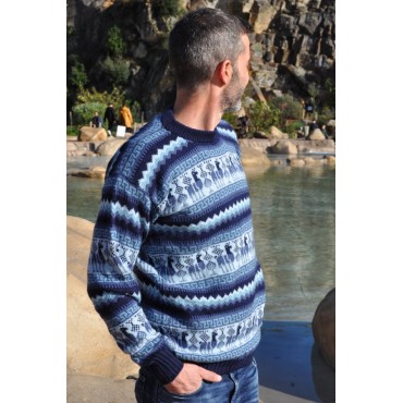 Pull épais pour homme aux couleurs dominantes bleu. Ce pull tricoté avec une belle finition est un vêtement élégant et très agréable à porter avec ses motifs typiques des andes, les lamas.